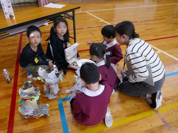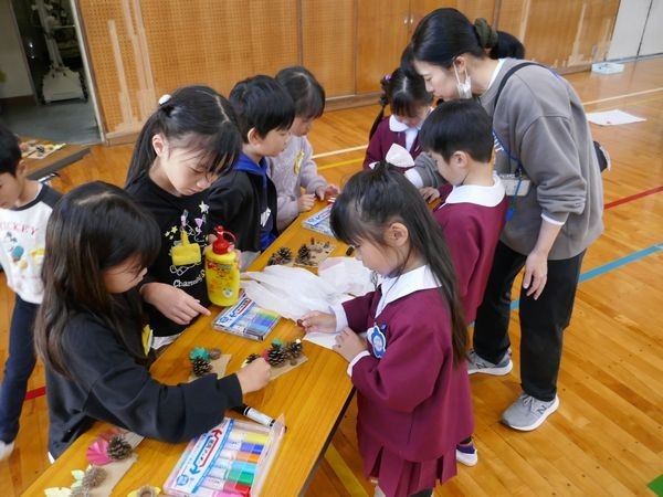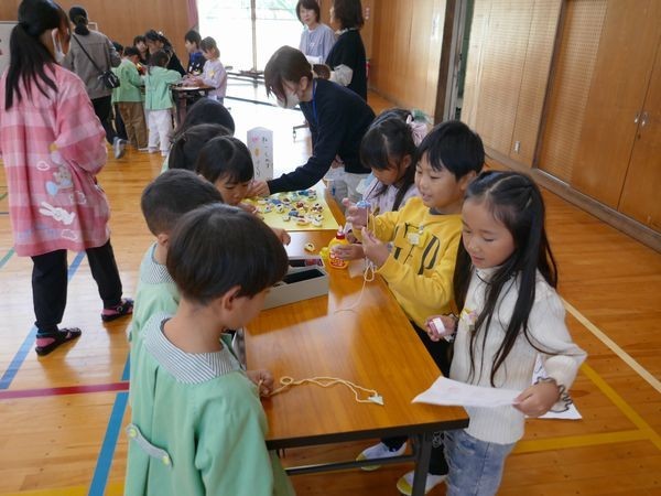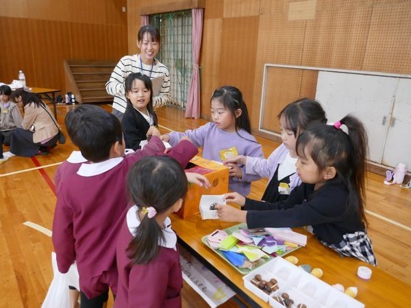 1年生は、生活科で準備した木の実を使って、年長園児が楽しめそうな屋台を作りました。どんぐりの迷路やネックレス、こまの屋台があります。くじびきを引いて、景品としてどんぐりをもらう屋台もあります。昨年はそれぞれの園の年長として、年中・年少のお世話をしていた1年生。今年は、小学校でさらに成長した姿を年長園児に見せようとがんばりました。