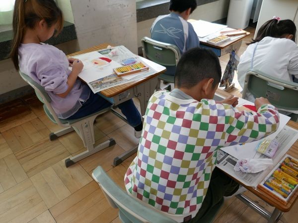 クレヨンで塗った後は、水彩絵の具で薄く背景に色を入れました。運動会の楽しさがよく表れた、いい作品が出来上がりました。