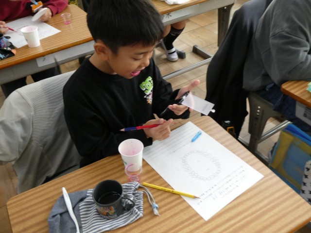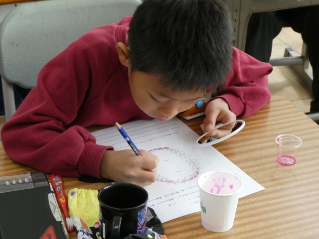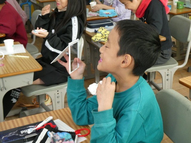子どもたちはまず、歯垢を赤く染め出す薬を使い、いつもの歯みがきでどれだけ磨き残しがあるかを確認しました。鏡で自分の口の中を見ると、歯と歯の間が薄くピンクに染まっていました。普段見逃しがちな歯と歯の間や奥歯の溝など、磨き残しがはっきりわかりました。