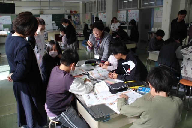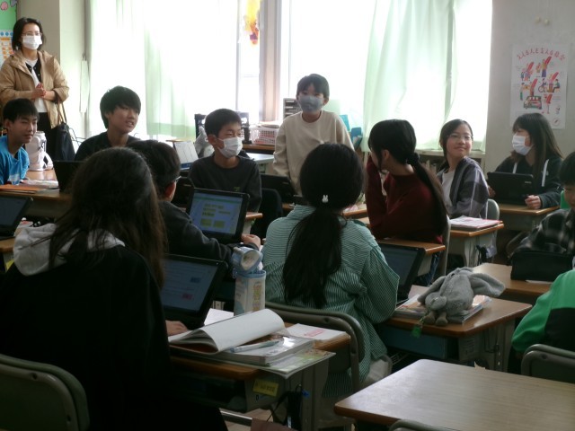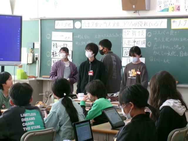 家庭科では、指定された材料を使って、どんなお弁当のおかずができるかを考える授業でした。保護者の方にもアドバイスをもらいながら、みんなで考えていました。調理実習でどんなお弁当ができるか楽しみです。道徳の授業では、将来の自分について考えていました。なりたい自分になるためには、どんな高校や大学へ行かなければいけないのか、一人一人が考えていました。目標をもつことは大切だと思います。ぜひ、なりたい自分になれるよう頑張ってほしいです。社会の授業は、司会進行も自分たちで行い、ディベート形式で行っていました。友達の意見を聞き、自分の意見を伝え合いながら授業を進めていました。さすが6年生です。