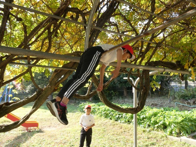 子どもたちは高いところへ登ったり、手だけではない体の部分でぶら下がったりしながら、楽しみながら自然と鉄棒に必要な「逆さ感覚」や「支持感覚」を呼び覚ましていきました。