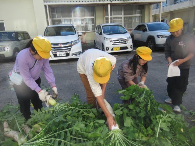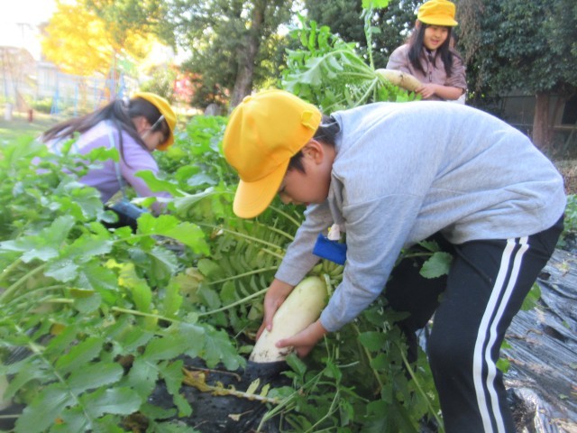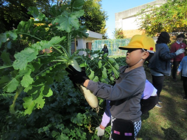 秋晴れの空の下、学校の畑から元気な声が聞こえてきました。 子ども達が種まきから大切に育ててきた大根が、ついに収穫の時を迎えました。