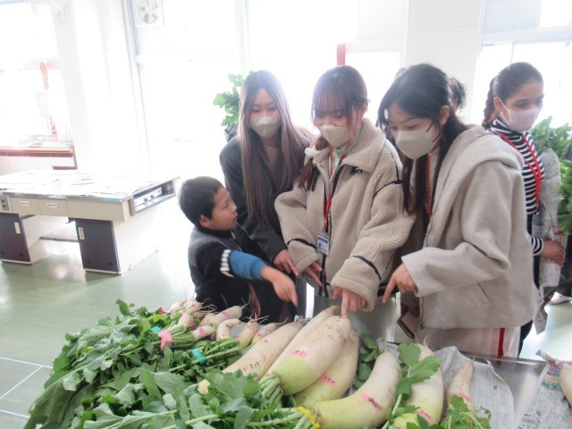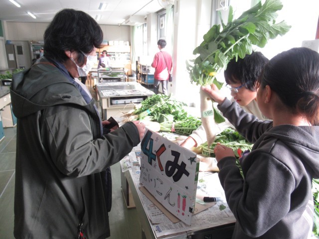 「新鮮な大根はいかがですか!」 最初は少し緊張していた子も、お客さんが来ると勇気を出して声をかけます。