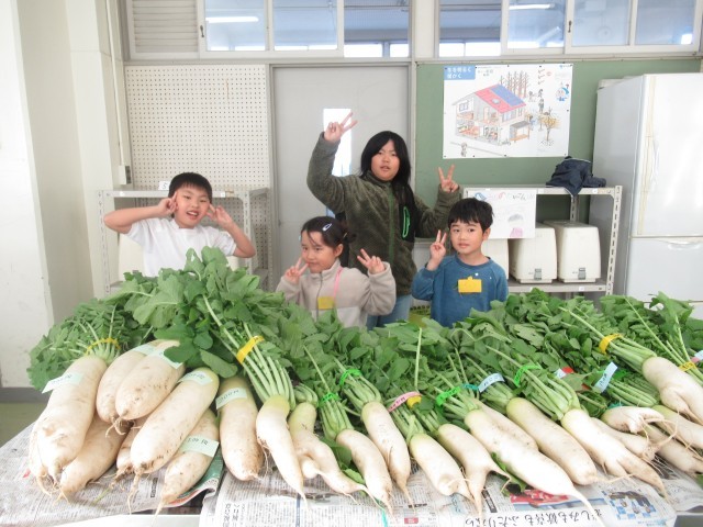 「うんとこしょ!どっこいしょ!」 土の中から顔を出したのは、子ども達の足よりも太くて立派な大根たち。