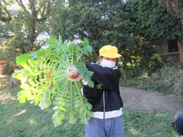 「見て!こんなに大きいよ!」と、重たい大根を肩に担ぐその表情は、達成感でいっぱいでした。