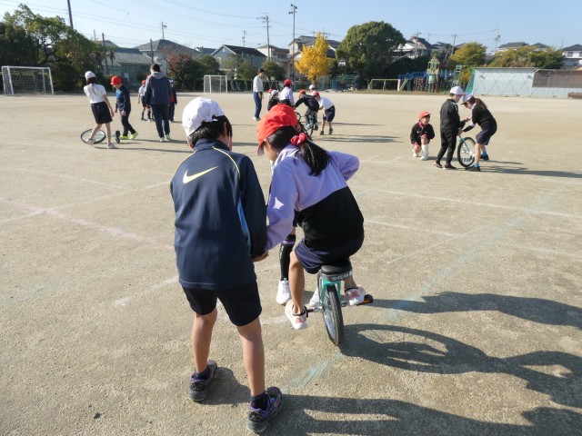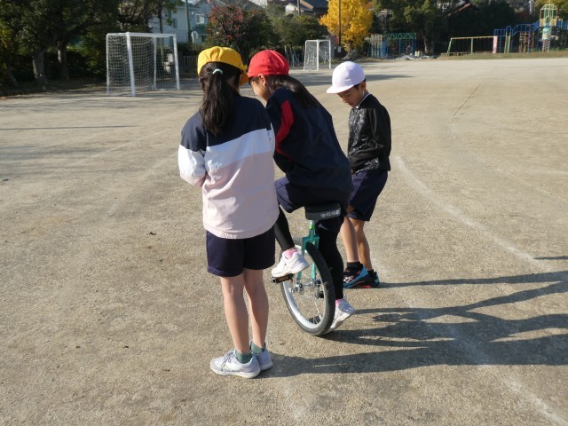 爽やかな秋晴れの下、体育の授業では「一輪車」の練習に取り組んでいました。