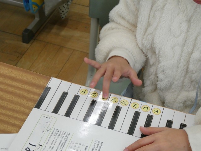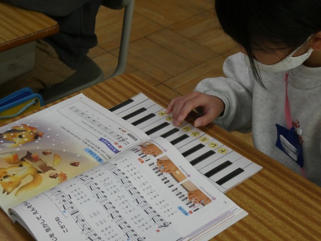 子どもたちは、真剣に動かしにくい指を動かし、音符を追いかけていました。