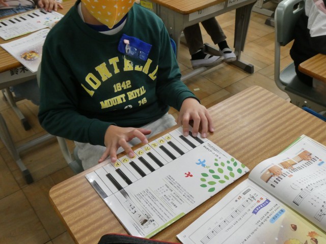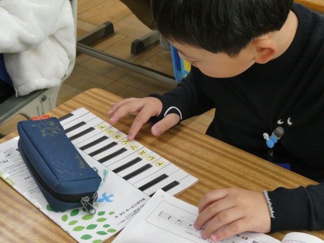 鍵盤ハーモニカでこの曲を演奏するために、子どもたちはまず、机の上に置いた鍵盤のシートを使って、指づかいの練習を丁寧に行いました。