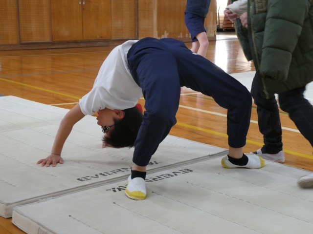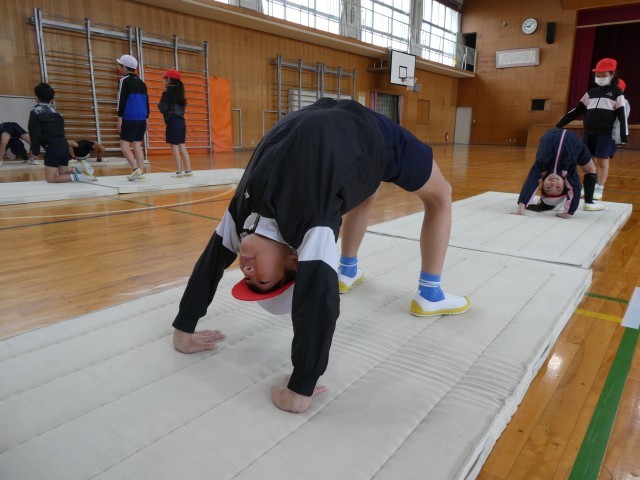 体育では、マット運動で「ブリッジ(逆さブリッジ)」の学習に取り組みました。床に手をついて腰を持ち上げ、体を弓なりに反らせるこの動きは、全身の筋力や柔軟性、バランス感覚を総合的に高める大切な運動です。
