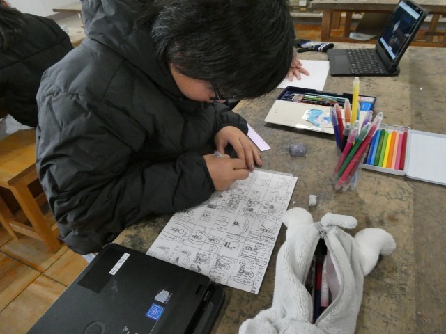 絵・まんがクラブでは、思い思いのキャラクターを紙に表現していました。中には、四コマ漫画を描いている子どももいました。