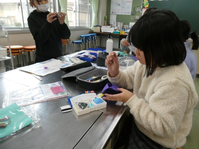 手芸クラブでは、裁縫道具を広げ、ティッシュケースやペンケースを熱心に作っていました。