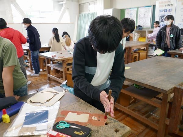初めての電動糸のこぎりから始まったこの制作。今日もキリを両手で回せない子がいました。それでも、友達同士で協力しながら、頑張って完成させた子どもたち。さて、どのような作品に仕上がったでしょうか。