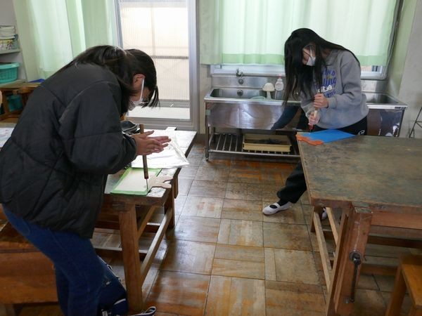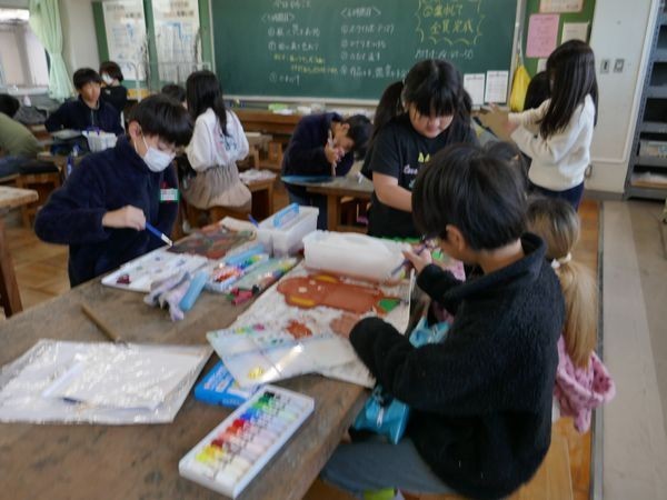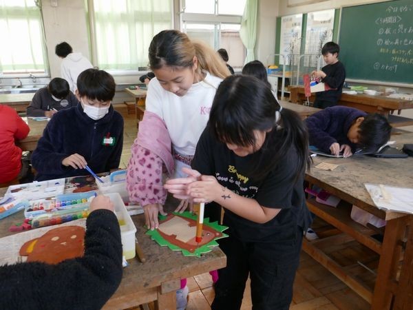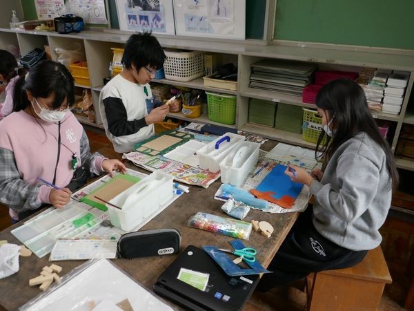 5年2組の図工は、ホワイトボードづくり。今日でいよいよ完成です。色を塗り、ホワイトボードの部分を切り取って貼り付け、キリで穴をあけ、ひもを通します。