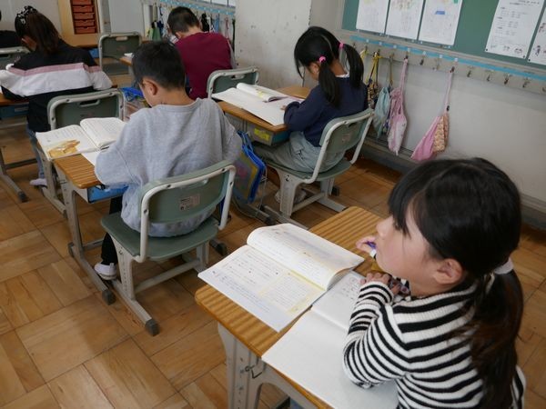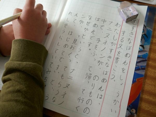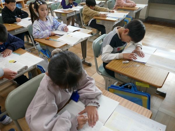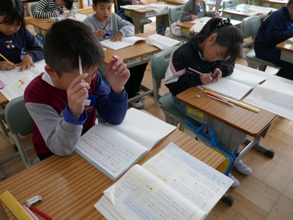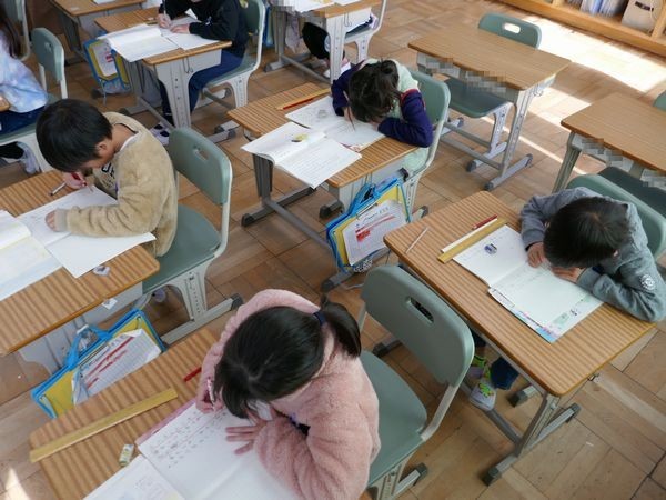 2年1組の国語では、教科書のお話、「みきのたからもの」の好きな場面を、家族に紹介する文章を考えました。宇宙からやってきたナニヌネノンとみきとの、ほっこりするお話です。子ども達は出会った場面、別れの場面、みきが将来の夢を宇宙飛行士とした場面など、一人一人がそれぞれのお気に入りの場面を選び、がんばって書いていました。