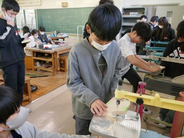 6年1組の図工はテープカッターづくりです。今日は電動糸のこぎりで板を切り、紙やすりをかけていました。久しぶりに使う電動糸のこぎりなので、刃の取り付け方を忘れていたり、板おさえを留めるのを忘れていたり、そして、「あ~!」と言いながら線とは違ったところを切り進んだり…。