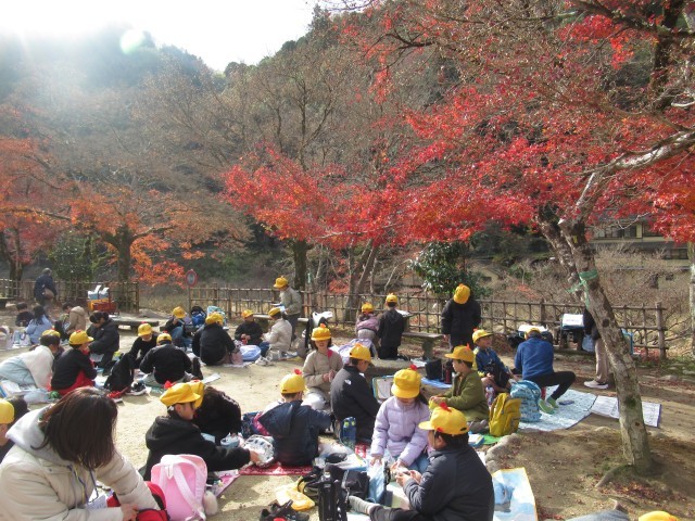 お昼は、まだ紅葉のきれいな景色が残る中、グループの友達となかよく会話を楽しみながらお弁当を食べました。