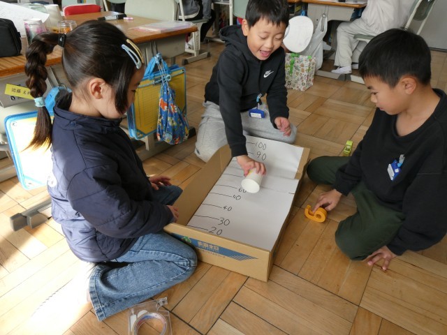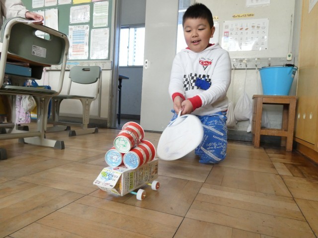 動くおもちゃを作っています。「パタパタ車」「コトコト車」「ストローアーチェリー」など、それぞれのグループで
