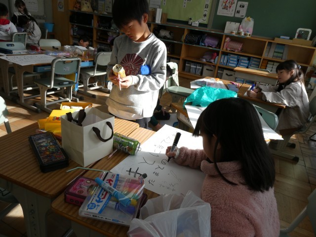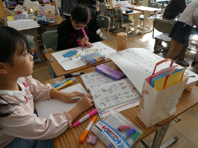 生活科や図画工作科との合科として、それぞれが説明したい題材を決め、作成に取り掛かっていました。