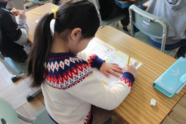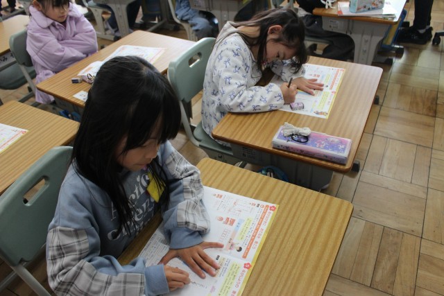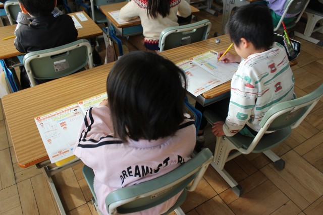 干支についての話を担任から聞きました。12干支や2026年の干支をみんなで確認して、やがて来る新年に楽しそうに思いを馳せていました。年賀状を書く練習をしました。「あけましておめでとうございます」「ことしもよろしくおねがいします」と丁寧に書きました。姿勢にも気をつけてとても整った文字を書いていました。