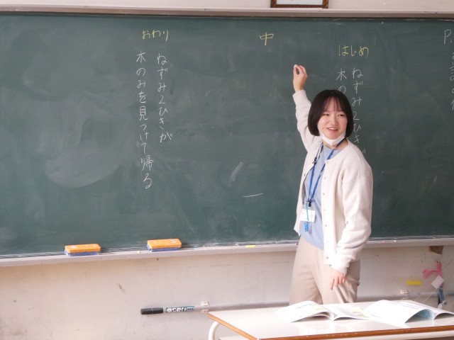 授業の導入では、先生が黒板に「はじめ」「なか」「おわり」という物語を構成する大切な要素を書き出し、子ども達は物語の流れを整理する方法を学習していました。