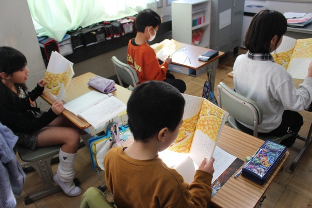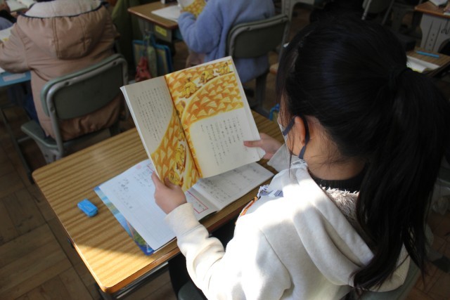 音読を手がかりに、転んでしまうと3年しか生きられないという3年とうげで転んでしまったおじいさんの心情にせまりました。怖くなってしまい布団にくるまり震えているおじいさんの様子を動作化したり、おじいさんのセリフを声に出し、どんな気持ちで音読したかをみんなで考えたりして、おじいさんの気持ちを深く読み取りました。教科書は両手で持ち、姿勢よく場面に応じた音読をすることができていました。