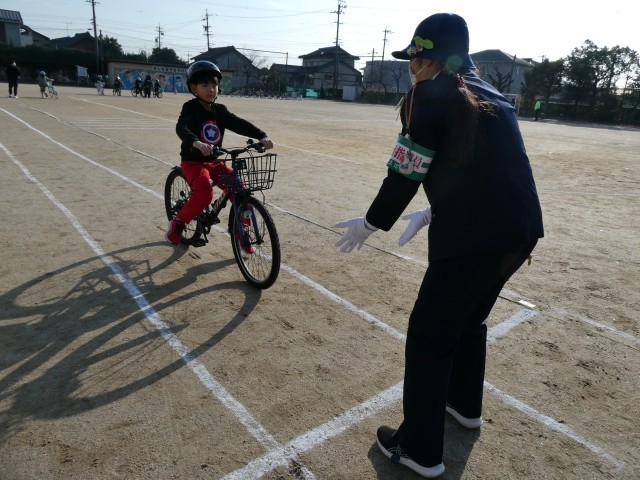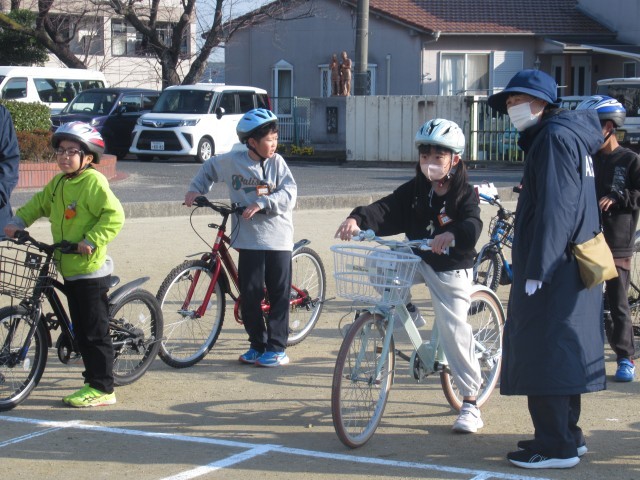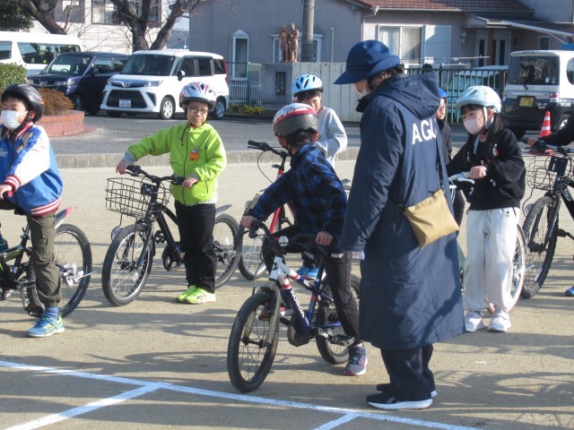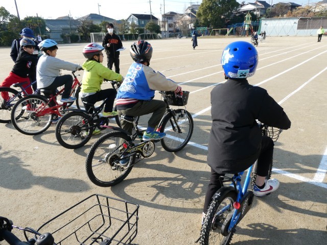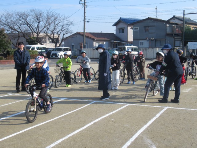 この教室は、交通安全指導員や役場の方々にご協力いただき、校庭に設けられたコースで実地指導を行いました。