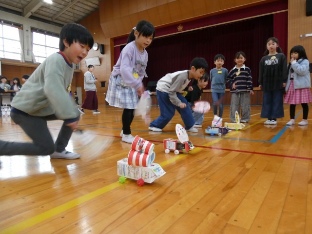 2年生はこの日のために、身近な材料を使っておもちゃがうまく動くか試行錯誤を繰り返してきました。