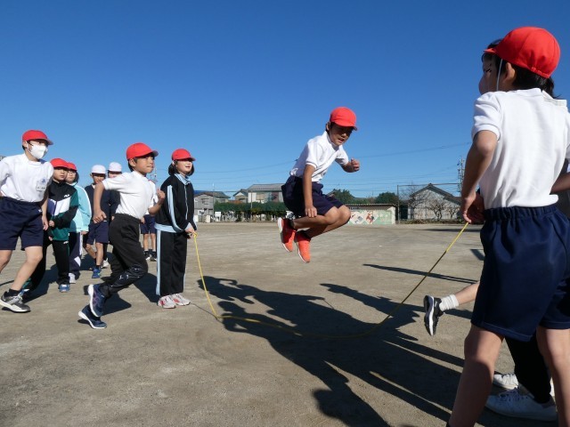 体育の授業では、短縄の後、長縄跳びにチャレンジしました。力強くジャンプする姿はさすが4年生です。