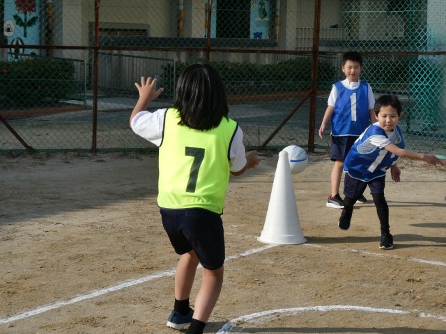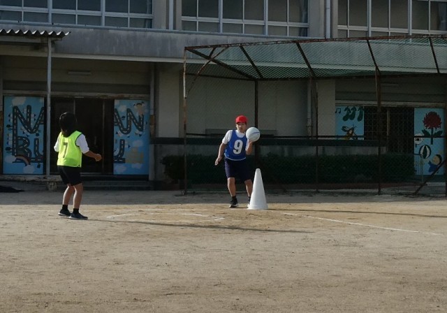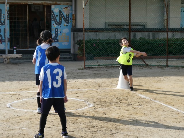 青空の下、ハンドベースボールで対決をしました。投げられたボールをタイミングよく打つことができるようになってきました。