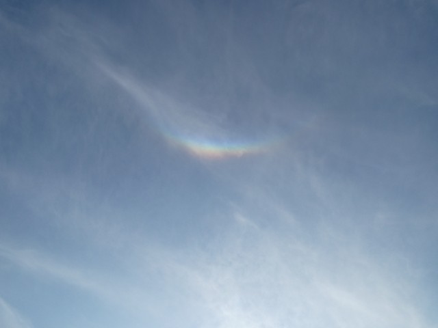 「彩雲」という雲が虹色に輝く現象です。子ども達が空を見上げるときれいな彩雲が見えました。この雲は、吉兆の雲、幸運を呼ぶ雲とも言われています。