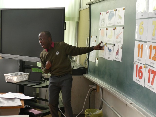 黒板に、子ども達に馴染みのある昆虫のカードをたくさん貼って、発音を一緒にしました。