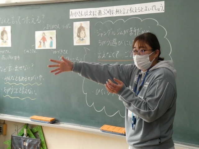 教材「なんと言ってつたえる?」を通し、公園で遊ぶ場面での出来事について、高いところが苦手な主人公・みかさんの葛藤について考えました。
