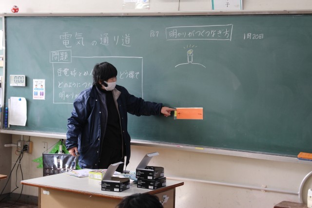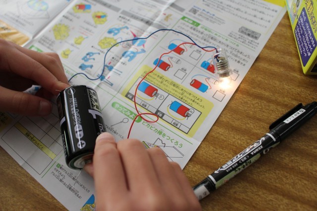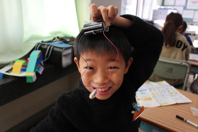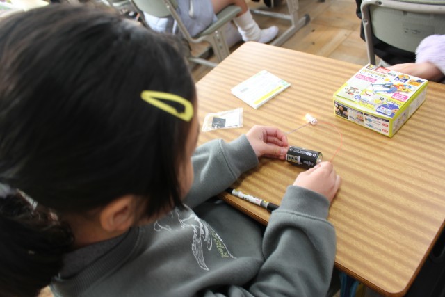 3年生の理科は「電気の通り道」の学習で、どのように導線をつなぐと豆電球に明かりがつくのかを実験によって確かめていました。