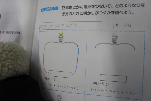 実験の手順書を見ながら、どの子も乾電池と導線をつなぎ、豆電球に明かりを灯すことができていました。学ぶ意欲が旺盛な子どもたちは、「赤色の導線と青色の導線を入れ替えても明かりがついたよ」「ビニールで覆われた部分をつないでも光らないけれど、ビニールがないところなら先っぽでなくても明かりがついたよ」とさまざまなことを自ら調べていきました。実験によって分かったことは、色鉛筆を使いながらていねいにノートにまとめることができました。