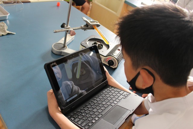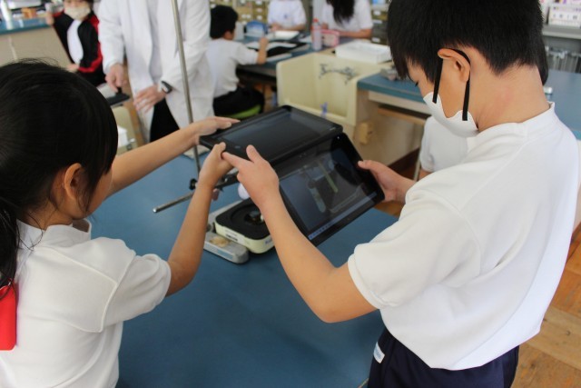 試験管の中に水と温度の変化によって色が変わるサーモテープを入れて、ガスコンロで熱しました。すると、炎を当てた場所とは違う場所から水は温まっていくという結果がでました。実験の様子をタブレット端末で撮影し、その動画を繰り返し見て、実験の結果を検証し、プリントにまとめました。自分の予想とは違う結果がでた子もいて、驚いていました。次回は子どもたちの「なぜ?」「もっと知りたい」をつなげて、炎を当てた場所ではなく、なぜ水は上から温まるのかを明らかにする実験をするようです。身の回りの不思議を自分で追究することができる子どもたちはとてもすばらしいですね。
