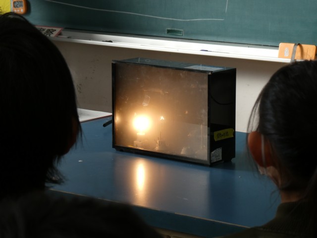 目に見えない空気の動きを観察するために、今回は透明な箱と線香の煙、そして電球(熱源)を使った実験を行いました。
