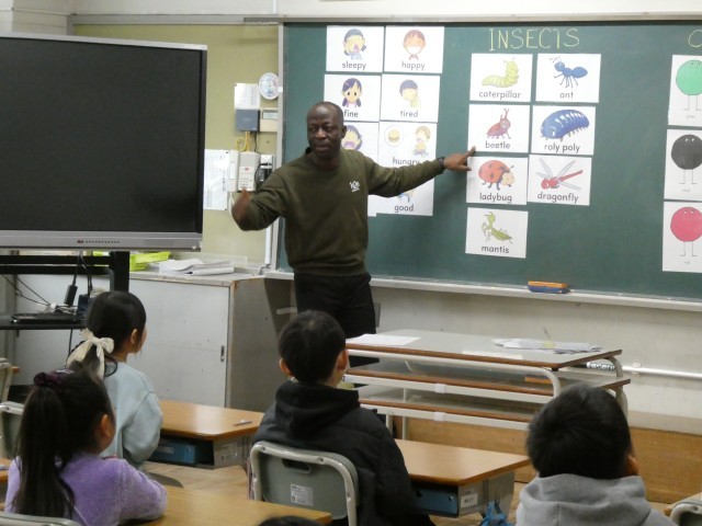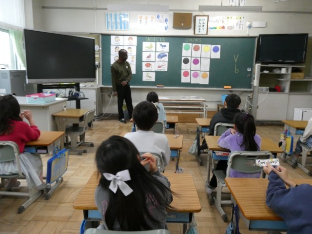 黒板には、子ども達にも馴染みのある「虫(INSECTS)」や「色(COLORS)」、「気持ち(FEELINGS)」などのカードを掲示して、ALTの先生の発音に合わせて元気よく発音をしていました。 先生が「Caterpillar!」「Ladybug!」と発音すると、子ども達も元気よく後に続きます。