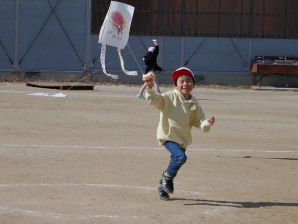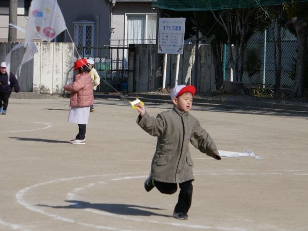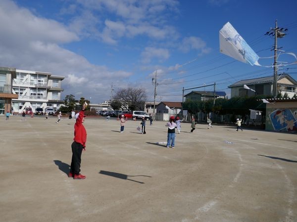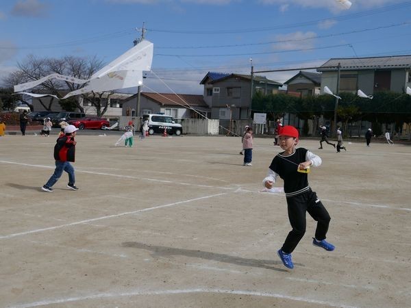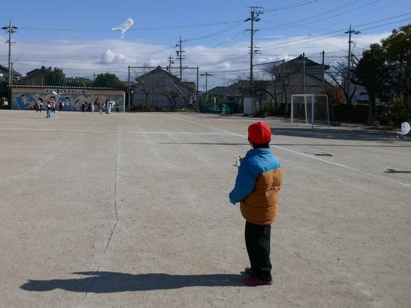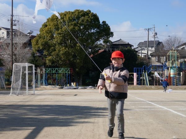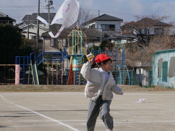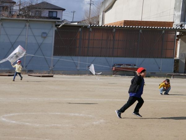 凧あげをした3時間目は風が弱く、なかなか凧があがりません。でも子ども達は冬を楽しむように、運動場を全力で走り回っていました。