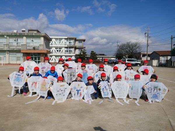 冬を楽しもう。生活科の単元です。今日、1年生の子ども達は、自分で作った凧で凧あげをしました。