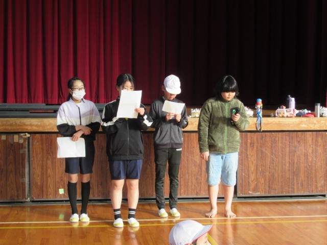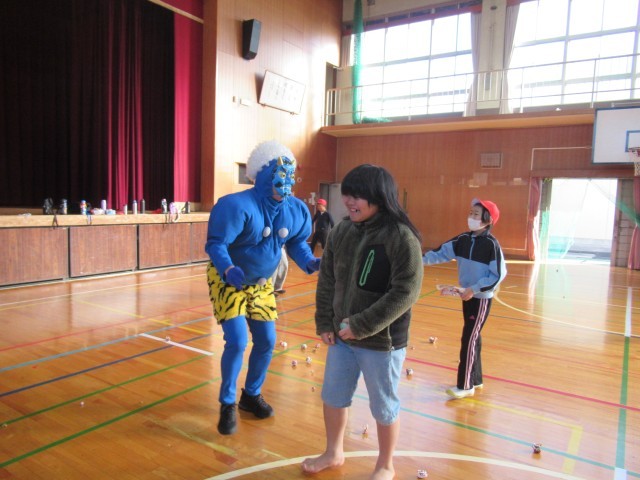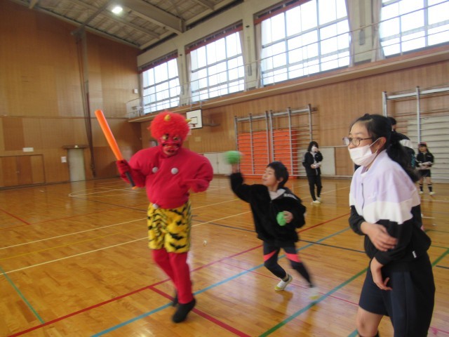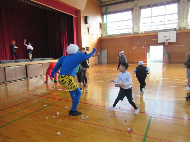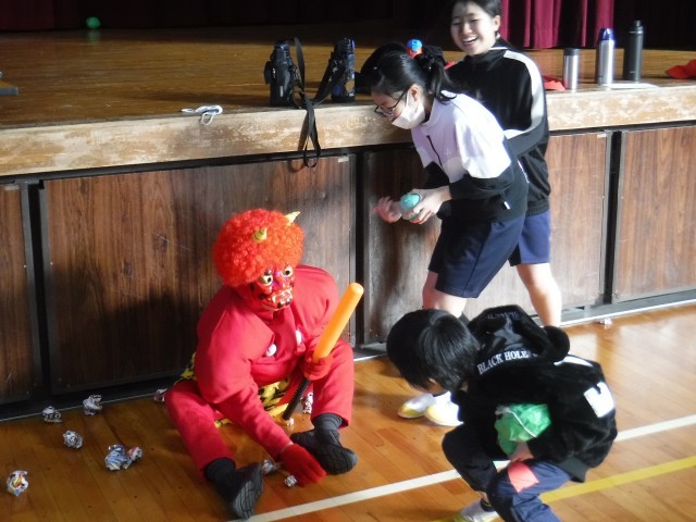 赤鬼と青鬼が現れると、自分たちが作ってきた紙のまめをもって、たくさん当てました。最後には、鬼たちを追い出し、自分たちに取りついている鬼に打ち勝つことができました。