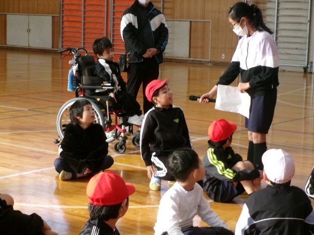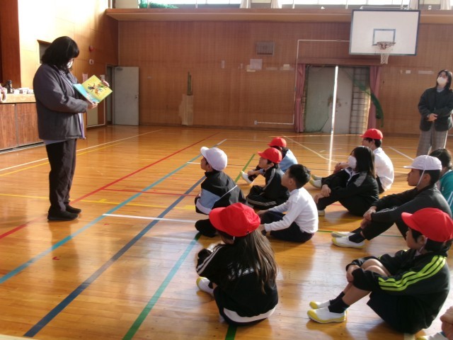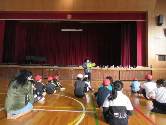 節分集会を行いました。まず、絵本の読み聞かせをしました。「せつぶんワイワイ豆まきの日」という絵本です。