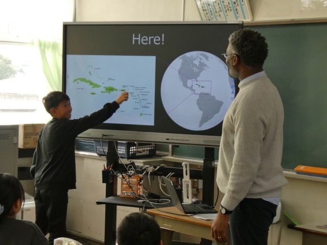 授業の始まりは、先生たちの自己紹介からでした。大型モニターに映し出された世界地図を見ながら、先生の故郷であるジャマイカやアメリカ、ガーナについて学びました。