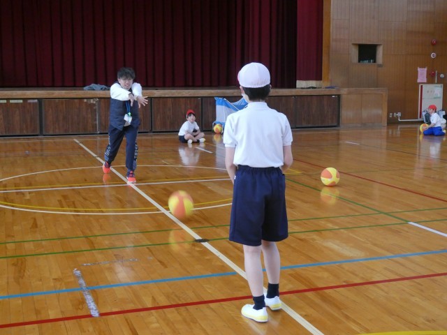子ども達は、ボールにどのような力が加わればねらった方向に飛ぶのかをバウンズパスで練習をしてから、シュートの練習しました。