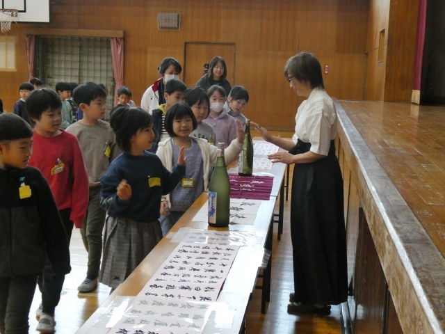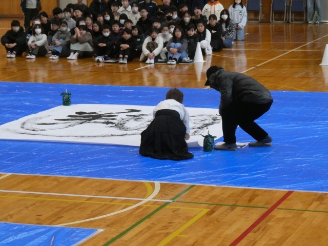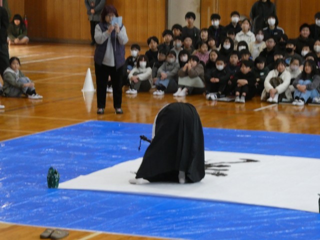 書道家の江川翠苑(えがわ すいえん)先生をお招きし、全校児童が鑑賞する「書道パフォーマンス」を実施しました。