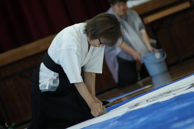 江川先生は、縦3m×横3mの巨大な紙に向かい、全身を使って力強く筆を走らせます。