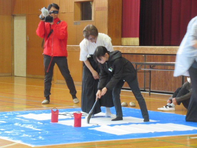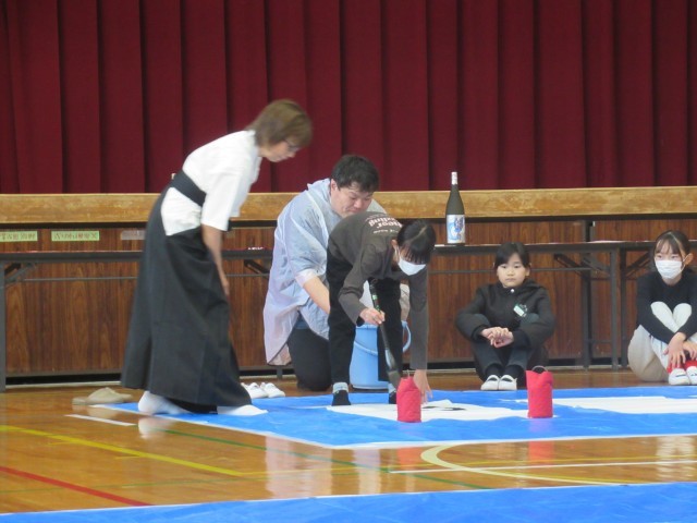 パフォーマンスの後は、4年生以上の代表児童3名が「大筆体験」に挑戦しました。