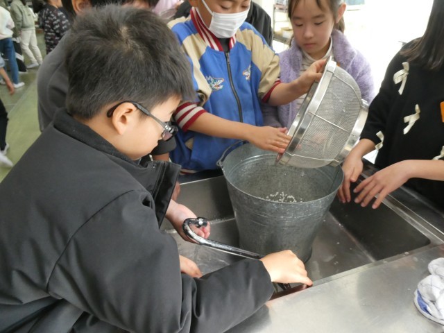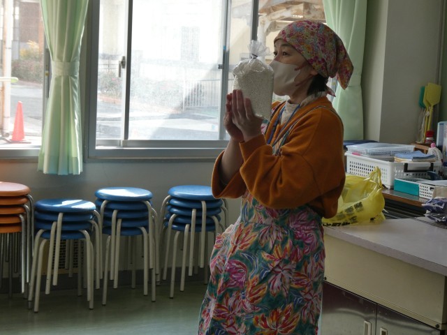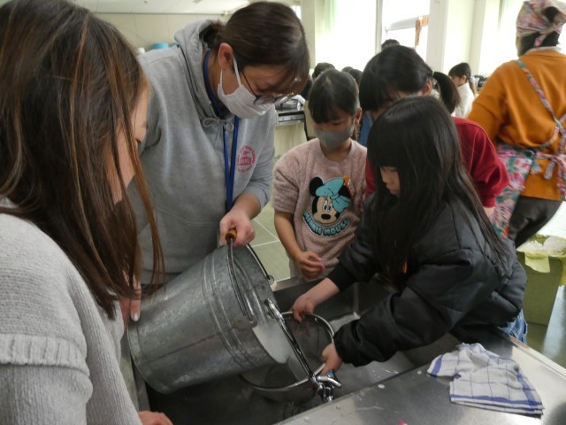 子ども達は、栄養教諭の先生から、もち米の丁寧な研ぎ方を教わりました。