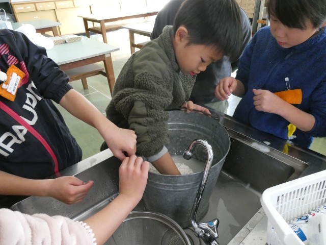 バケツを囲んで協力し合いながら、きれいなもち米をしっかり研ぐことができていました。