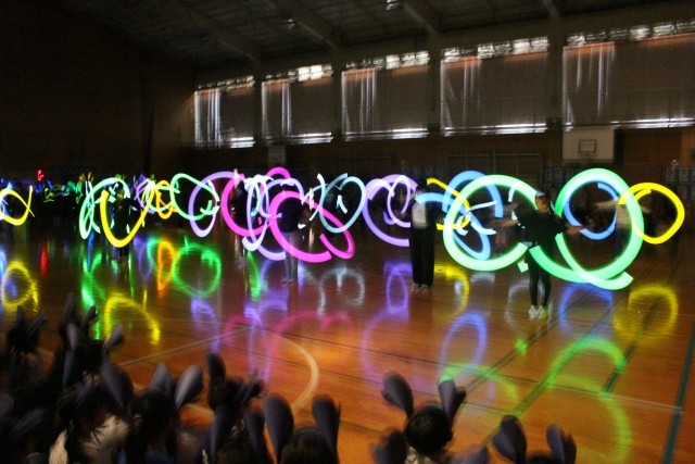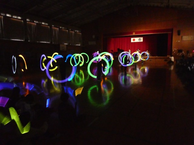 暗闇の中に光の輪が描かれて、幻想的な雰囲気がつくられました。続いて、スポットライトに照らされた子たちが上手に1曲を歌いあげました。在校生たちからは「ブラボー」と称賛の声が飛び交っていました。