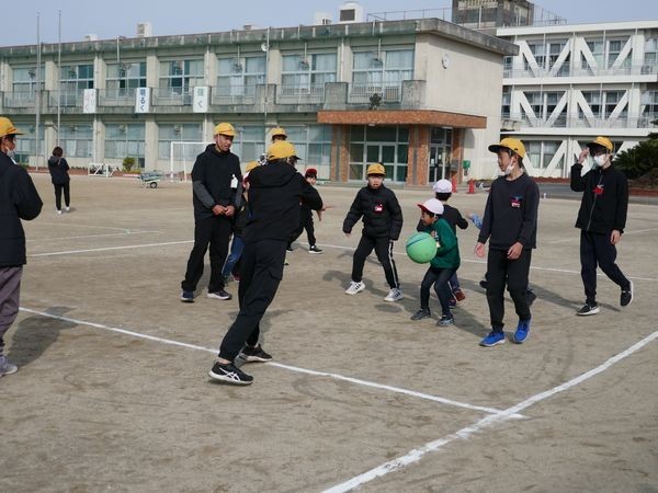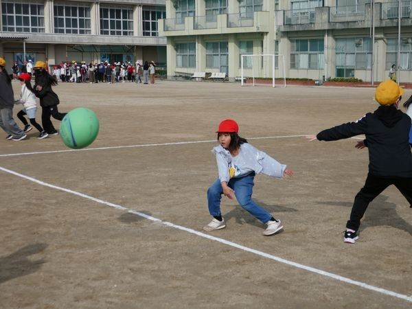 今日の1時間目は、1年生と6年生のペア活動。1年1組と6年2組はペアドッジボールです。ペアのどちらかがボールに当たると、ペアの2人とも外野へ異動です。6年生は1年生に「投げる?」と優しく聞いて、ボールを渡していました。